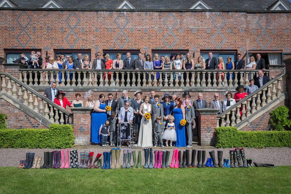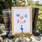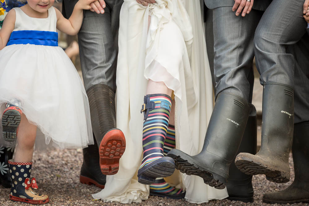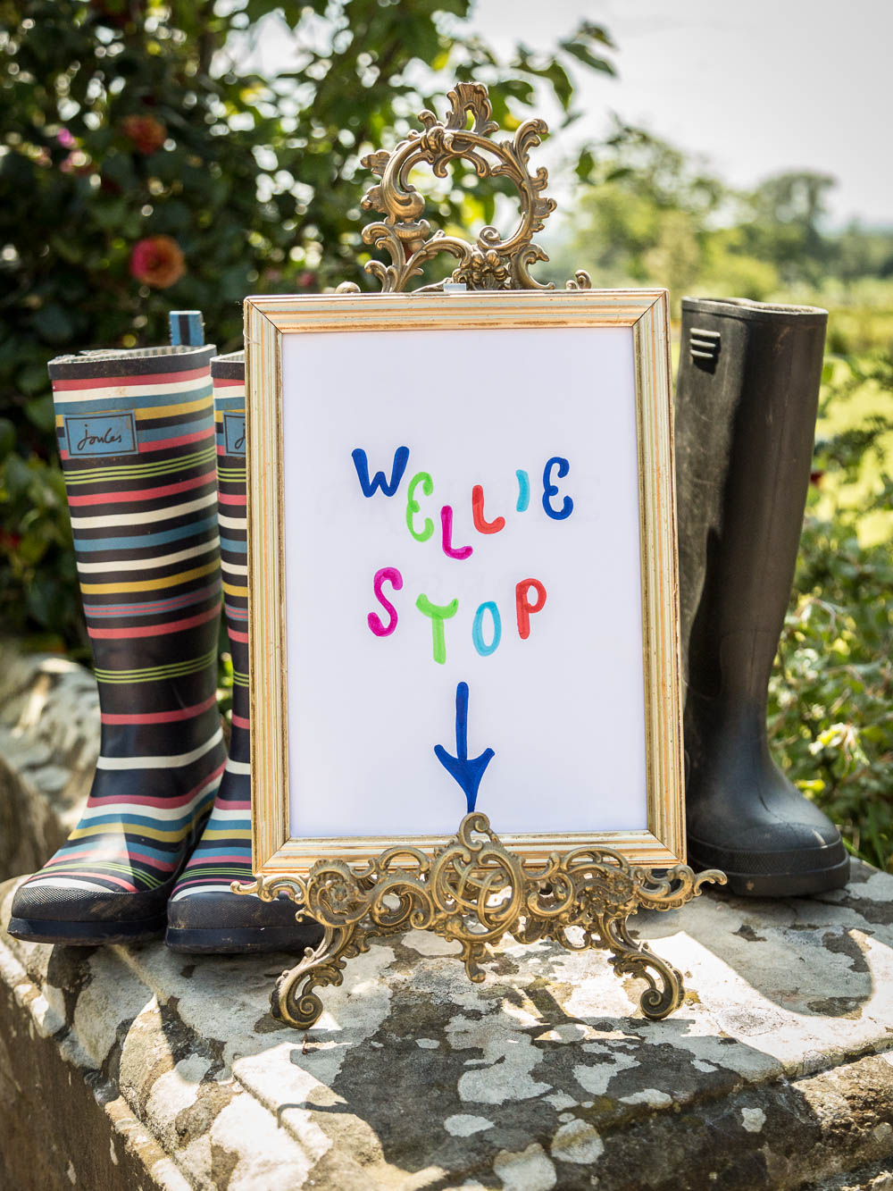 To fit in with our theme the place names were old vinyls with guests’ names on them, the table names were groups/albums close to our hearts, our invitations were like gig tickets and we had lots of photographs with our guests in wellies.