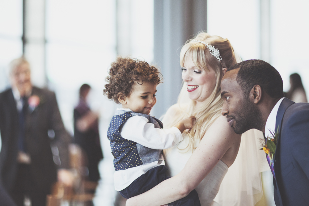 It’s hard to define a favourite part of the day, we enjoyed it all from getting ready in the morning to doing the Conga in the evening! The vows in church were a really special moment when we both had to hold back the tears. We also really enjoyed hearing the readings we had picked for the church – one was from Isaac’s favourite bedtime book called ‘Me’ by Emma Dodd. It was lovely to have our son with us on our wedding day and fitting that we could include a reading that meant something to all of us. One really unique part of the day was when we arrived at venue and our photographers ushered us to a bridge next to The Lowry for photos whilst hundreds of Man United fans headed to the match. It was moment on our own away from the guests, yet surrounded by lots of friendly strangers from Zariah’s team (Zariah would like to add: we won 2-0 so it was a great day overall). We also had fun later on when we took to the balcony of The Lowry for group pictures with our friends. It was really cold and windy so after a few drinks, we all jumped up and down and started chanting silly songs to keep warm. It just confirmed how lucky we are to have such wonderful friends!