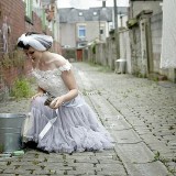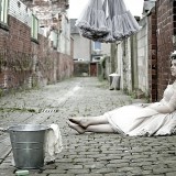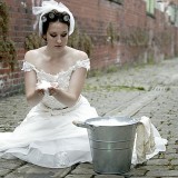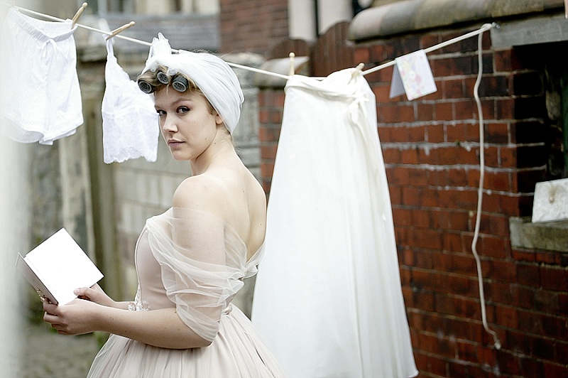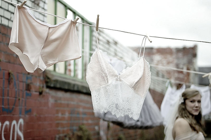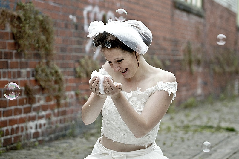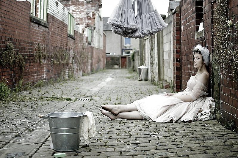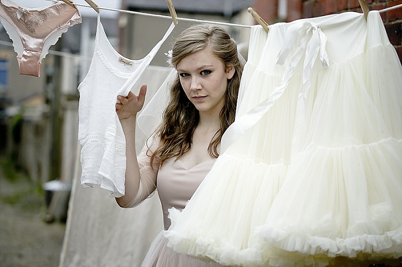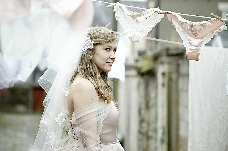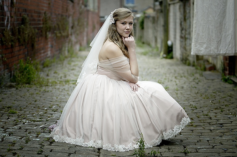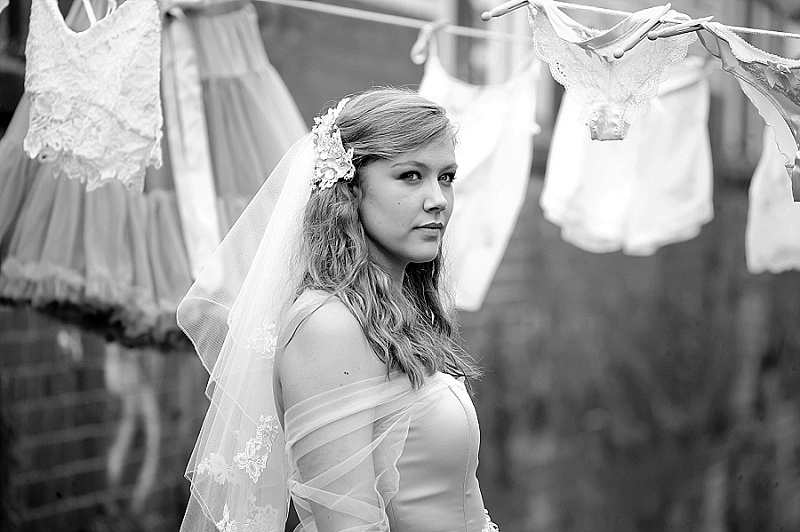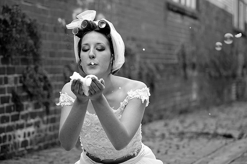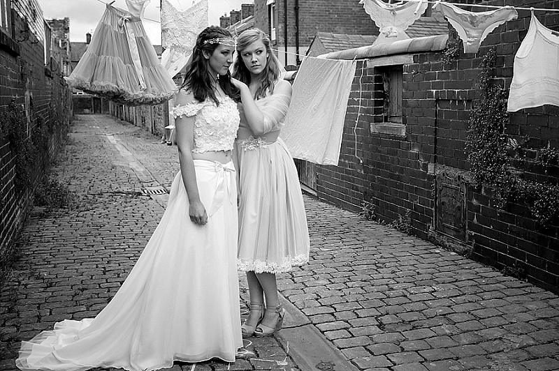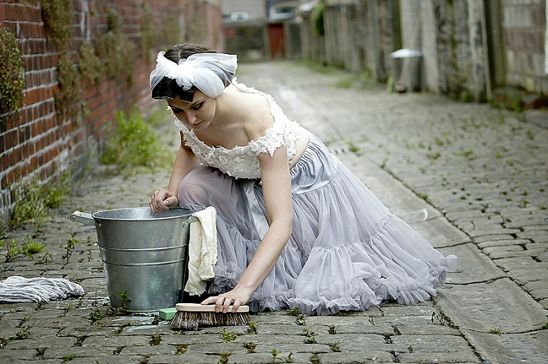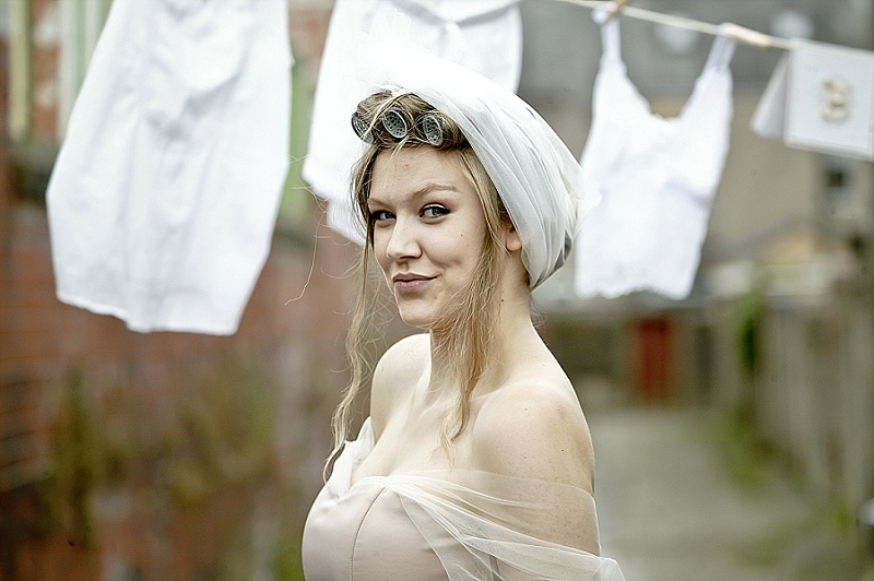 We wanted the shoot to be fun and light hearted. It isn’t necessarily a theme you might recreate for your own wedding, but we wanted to take the idea a step further than developing bridal looks. We wanted to be creative and couldn’t resist putting Chloe and Hatty’s hair in rollers and having them scrubbing the cobbles. Que scrubbing brushes, buckets and metal dustbins… really not something you would do in your wedding dress, but these are actually some of our favourite images.