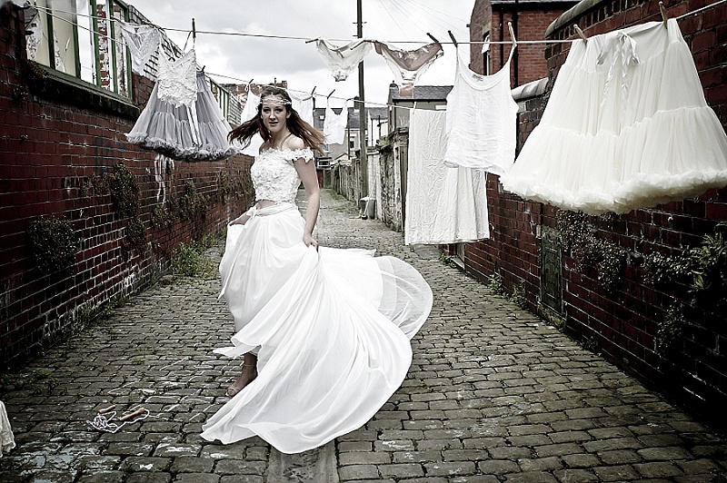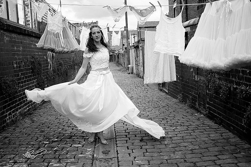 The shoot was set in a back street in Rishton; a row of terraces on one side and the empty shell of an old mill on the other. Zoie chose this street as it is reminiscent of so many mill towns in the area. The idea was to create a vintage feel. Not the manicured, glossy and pretty vintage we’re all so familiar with, but a more down to earth, almost gritty vintage. One without airs and graces and more of a focus on the history our lives are built on.