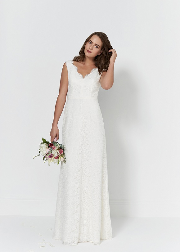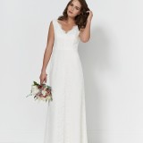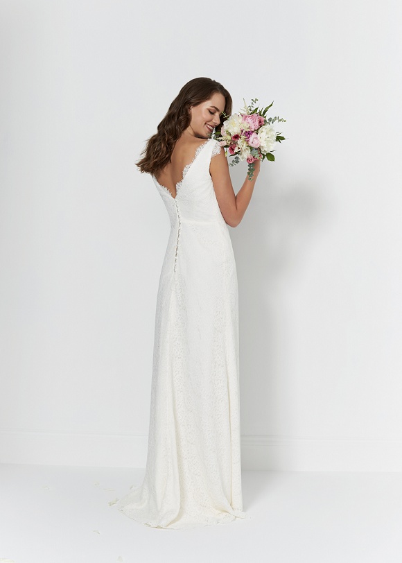 Bianca: All about the bohemian vibes with this stunning lace column gown and v neckline detail.