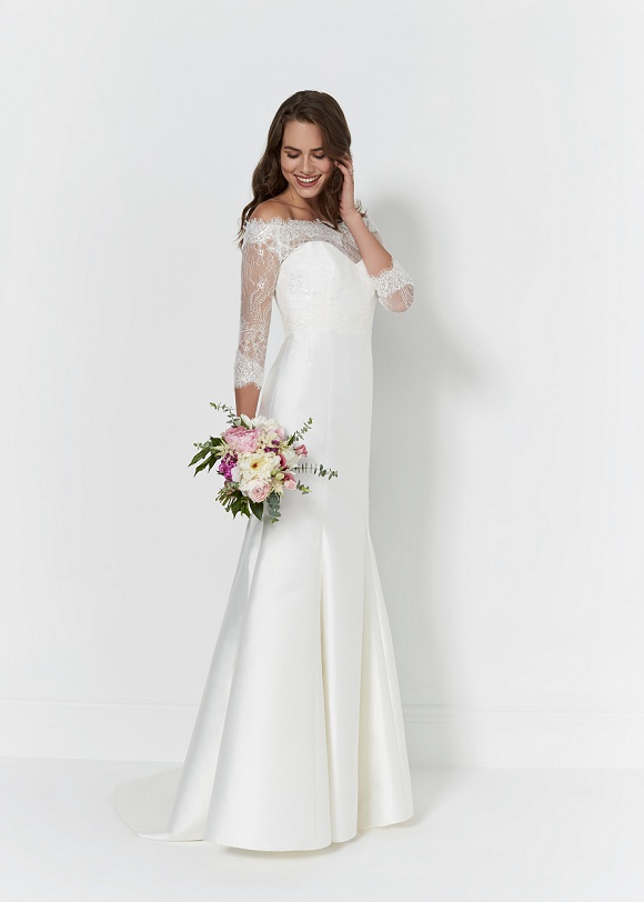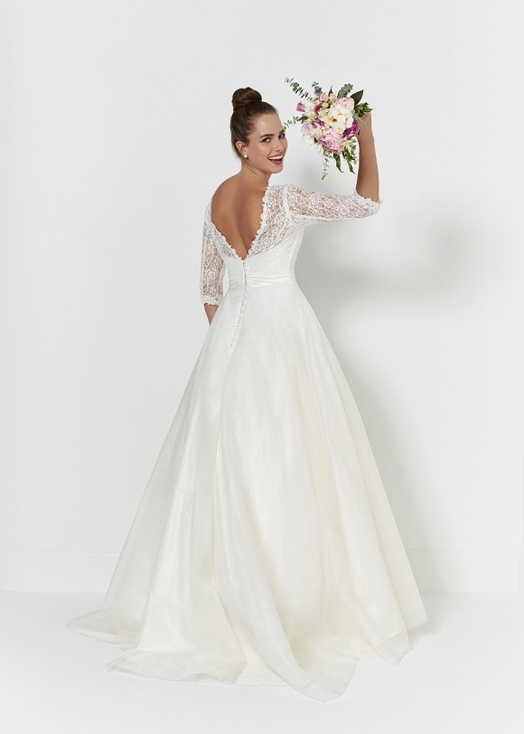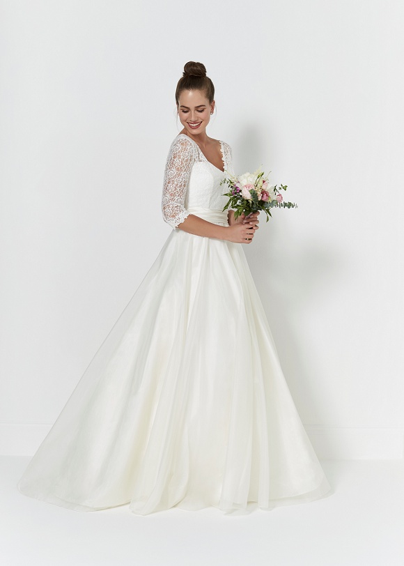 Connie: Oh-so traditional, Connie features a beautiful full ball gown and lace three-quarter-length sleeve. Also available in tulle bodice.