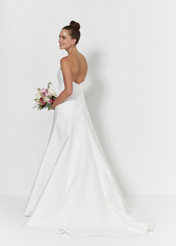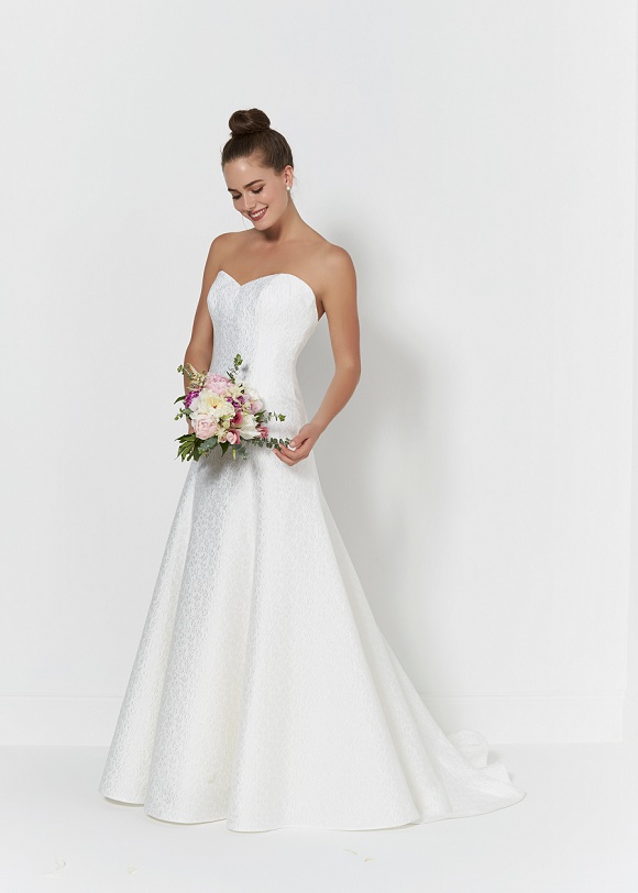 Ebony: Simple yet stunning, this fit and flare gown features a gorgeous brocade fabric and soft sweetheart neckline.