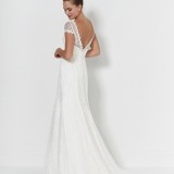 Gwen: Beautiful lace fit and flare gown features delicate lace cap sleeves and a wow factor v back.