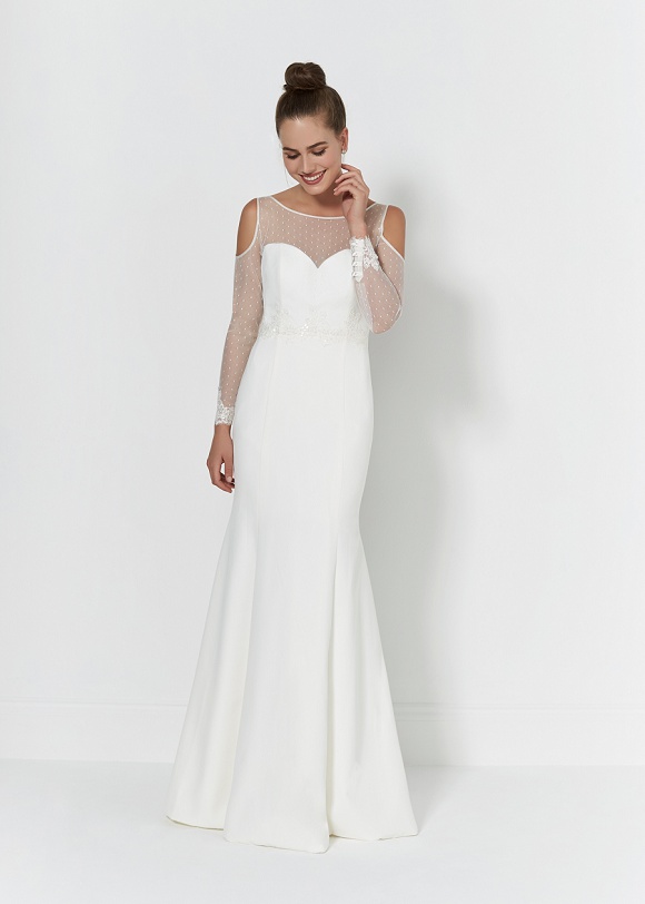 Luna: Make a statement with our cold shoulder Luna gown, featuring a beautiful spot tulle and lace cuff detail – simply stunning.