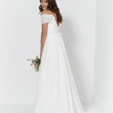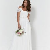 Scarlett: A drape sleeve A-line gown features a beautiful diamante waist detail, lace bodice and chic off the shoulder draping!