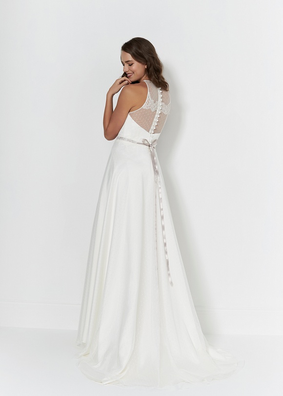 Taylor: Show-stopping Taylor features a spot tulle racer neckline and soft A-line shape, styled with a stunning lavender ribbon belt. The belt is also available in a variety of colours.
