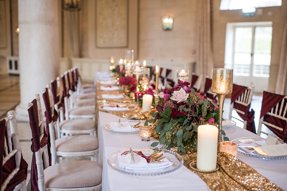 The decoration was beautifully designed and put together by Laura from Ambience Venue Styling in York. The team worked with a rich, opulent burgundy, gold and red tonal colour palette and there were tables laden with scented candles, extravagant golden cutlery and sequined tablecloths.