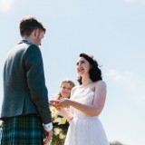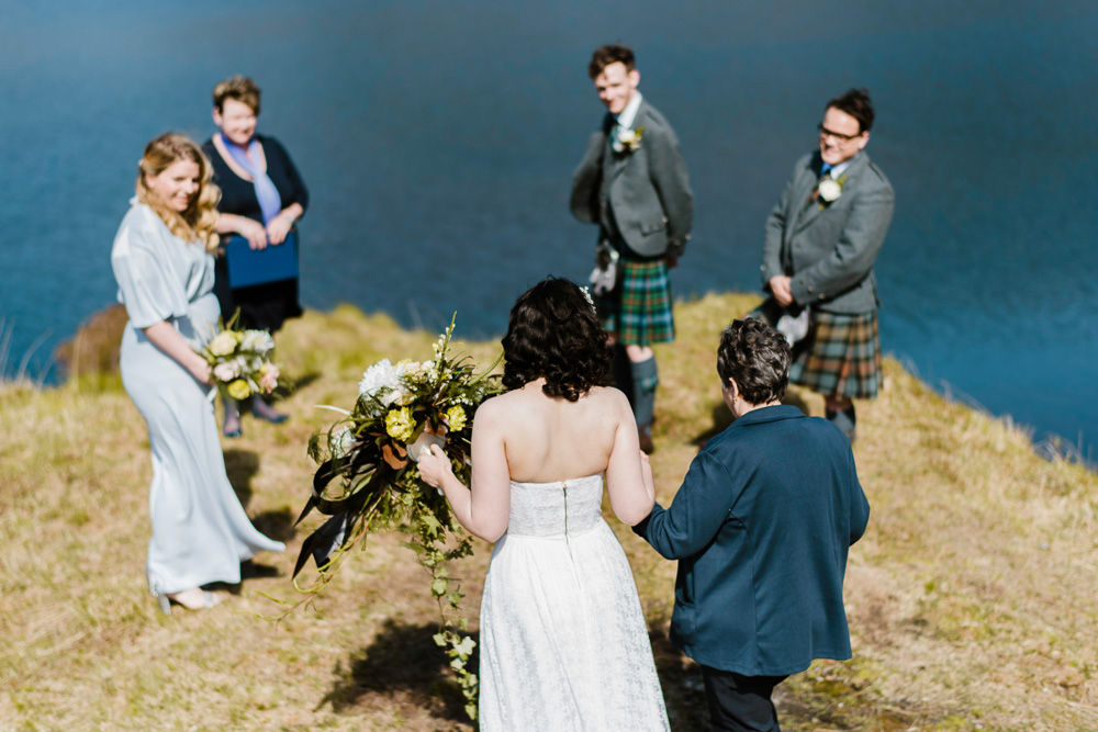 Following a ‘first look’ moment by the harbour when Chris and Rebecca saw one another for the first time on the wedding day, the small wedding party travelled by boat from Elgol over the sea to a remote area of Skye and trekked into the wilderness for about 20 minutes before finding the perfect place to hold the ceremony. Following the vows there was food, drink, card games and doughnuts for a truly chilled reception.