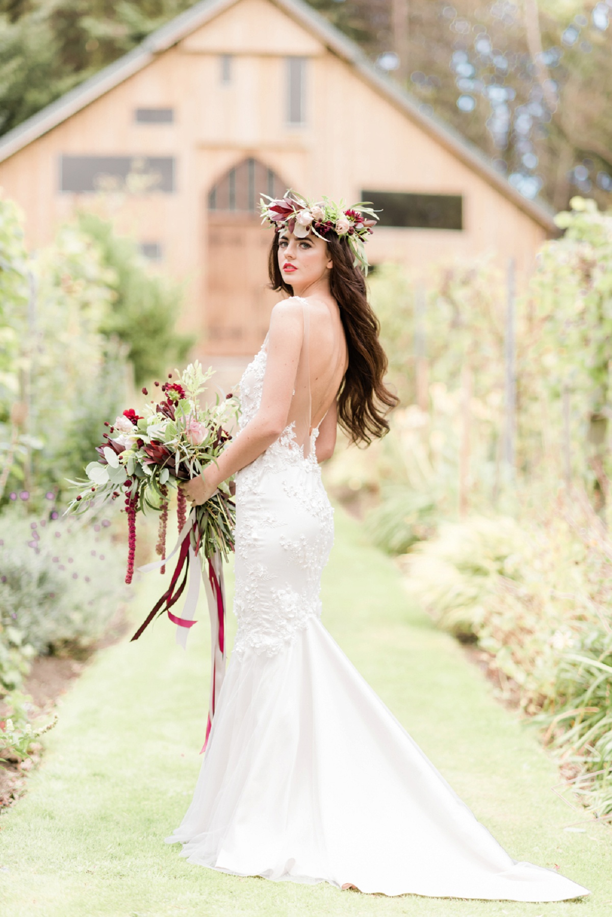 The styling has a distinct DIY feel to it; showcasing what’s possible if you let your creative flair run wild. As for the colour palette – this is an understated one, but a rich burgundy tone adds a contemporary twist, offset by softer blush and cream hues. From the textural foliage and whimsical flower crown to the hand-dipped candles and some rather wonderful food styling featuring brie, figs and honeycomb – every detail within this shoot is simply exquisite. Pinterest boards at the ready, ladies!