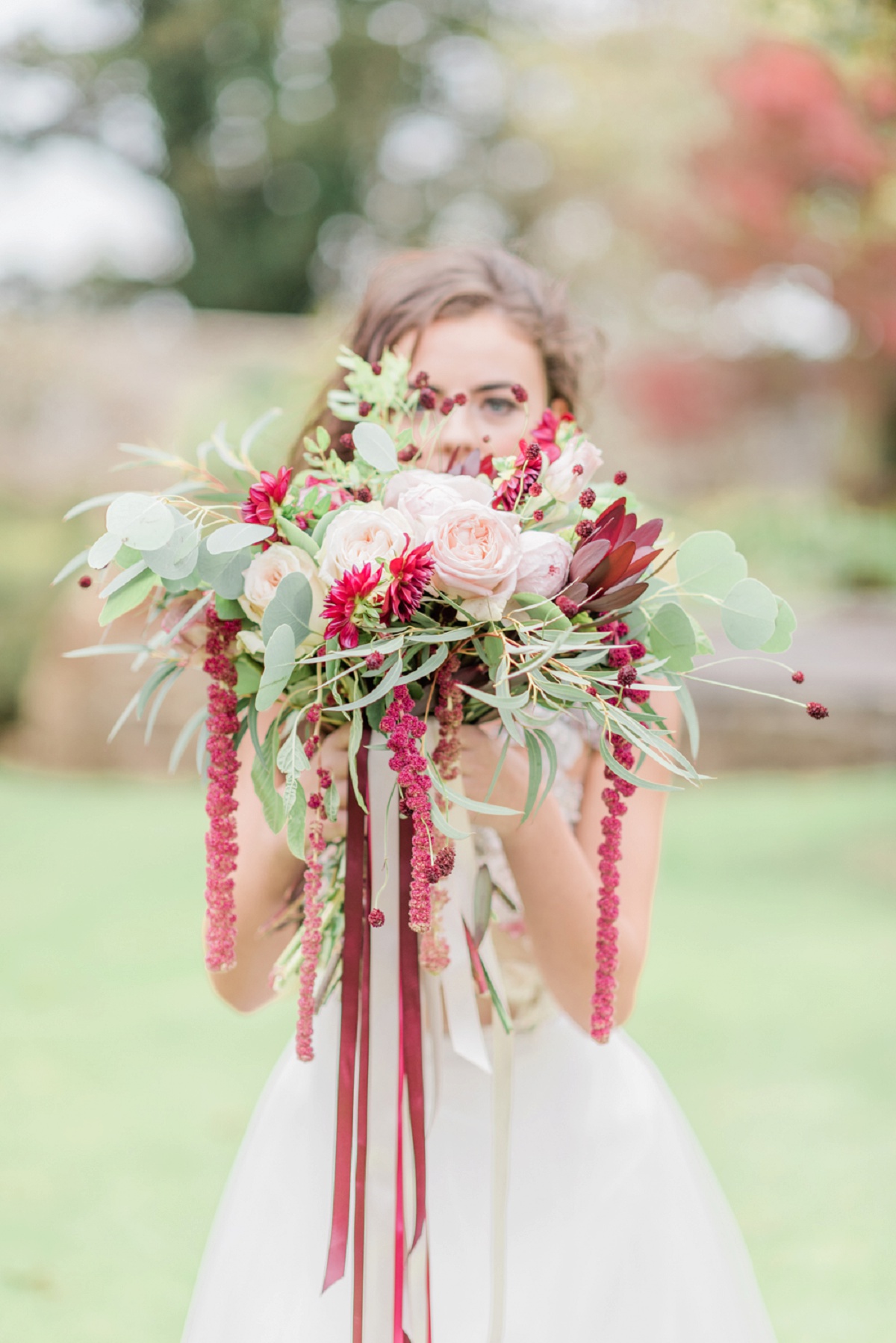 : We wanted to create a versatile look with a colour palette that could be used any time of the year – spring, summer autumn or winter. We did this by using light subtle blushes and textural foliage but accompanying them with one stand out colour – burgundy.Creating a ceremonial set up and a more relaxed outdoor reception style backdrop at our venue, Stanton Hall, meant there was a lot of versatility throughout the day, but ultimately it was all focused around our vision for a light, airy shoot.