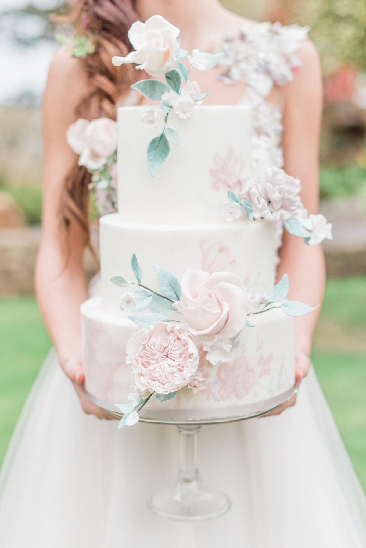 The wedding cake was designed by Sadie May Cakes with a rustic romantic theme and soft colour palette to work with the floristry and beautiful gardens at Stanton Hall. This was soft and whimsical with an elegant theme. Hand-painted touches gave the cake a personal artistic touch for the modern bride whilst being subtle too. The cake was designed to complement our Kate Fearnley dresses and the overall styling of the shoot and the photography. Matching hand-painted macaron and white gem chocolates perfectly finished off this romantic look. We also had gorgeous wedding stationery supplied by Ruby Shoes Wedding.