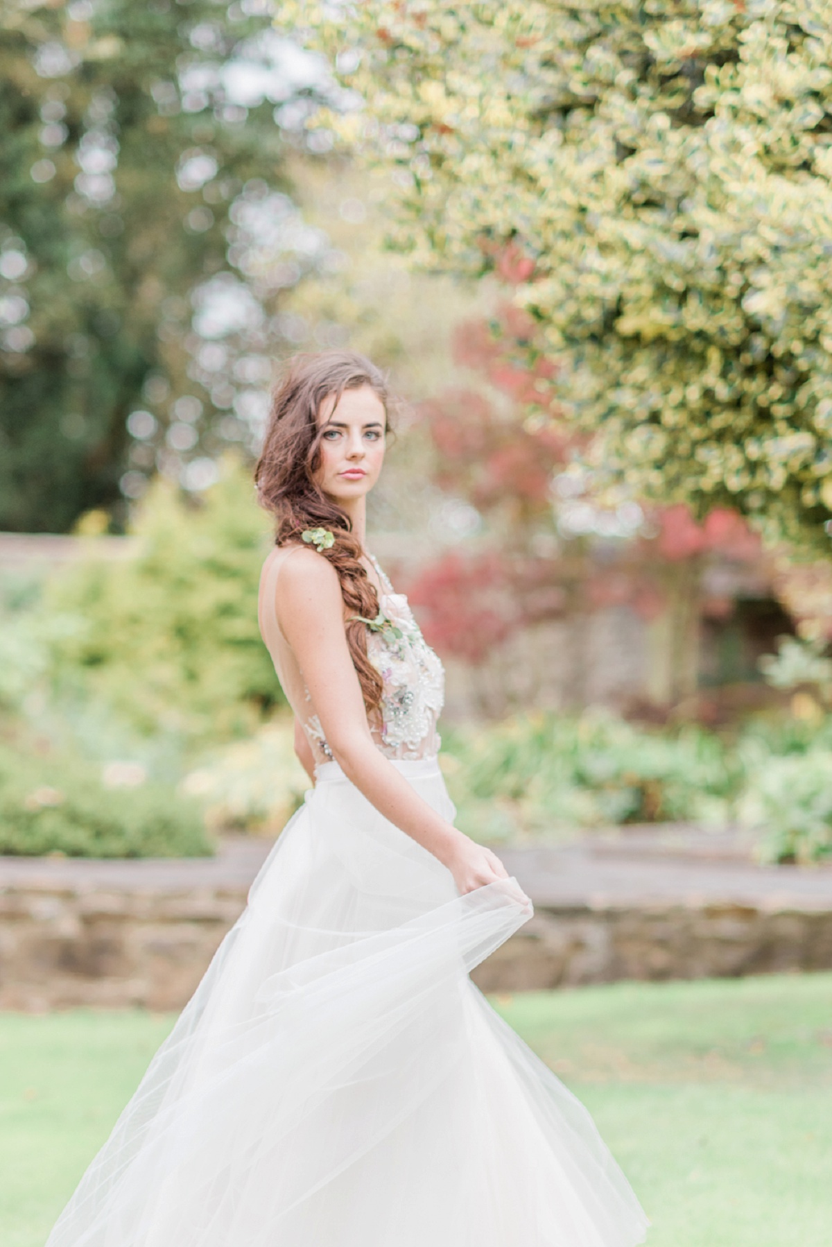 The second look was more a woodland wonderland style. Tina created the perfect side plait with blousy roses and woodland foliage which was styled with Kate Fearnley’s second dress of the day – Flora – part of the wonderland collection. The more outlandish, dreamy and romantic white embroidered dress with pops of colour gave a much bolder statement with lots of embellishment and embroidery. Urzsula’s makeup was of a subtler tone this time, featuring a pink blush lip and a blushed cheek.