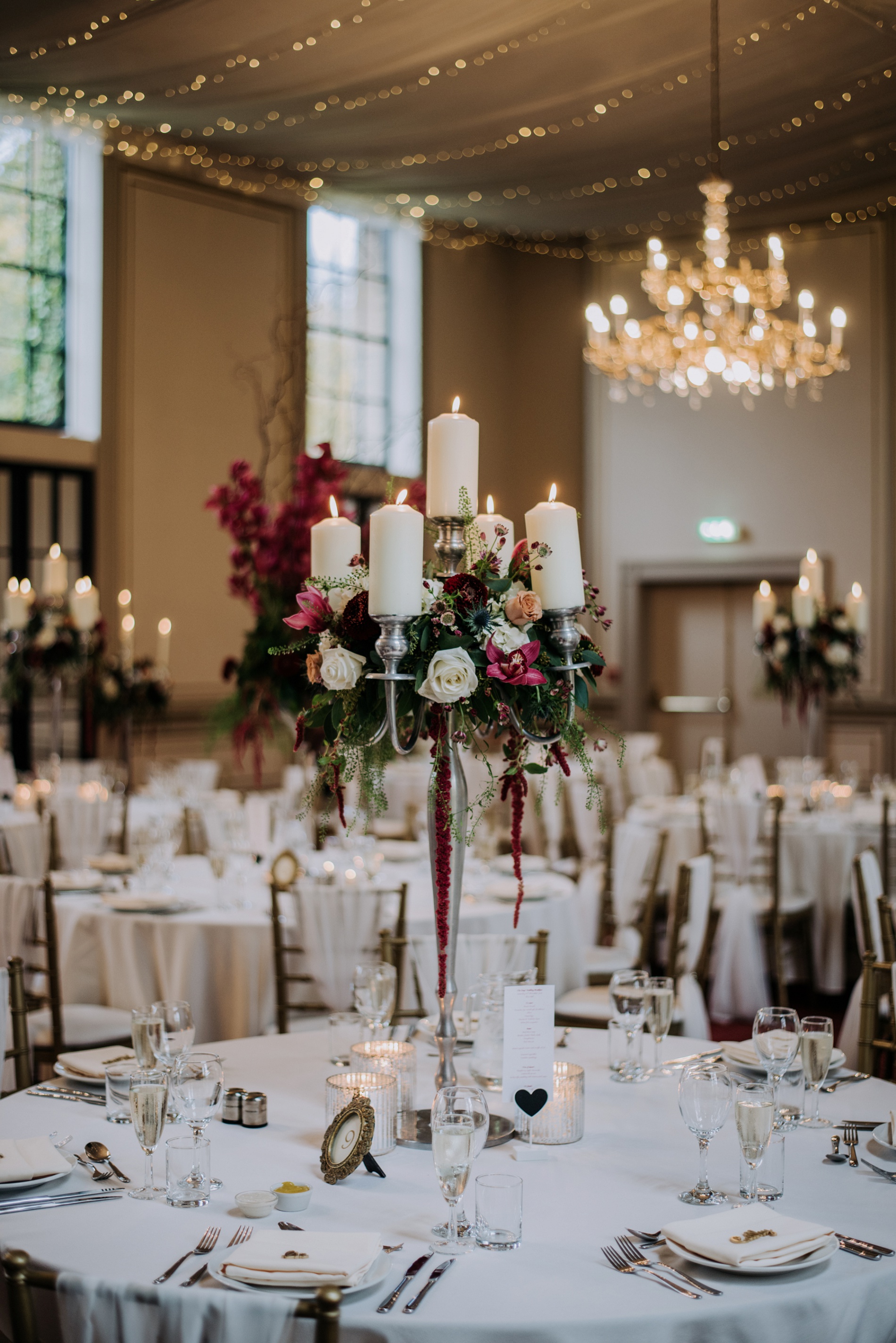 Statement claret red and autumnal tones dominate the colour scheme, offset by a combination of roses, orchids, thistle, eucalyptus and foliage. Candelabras and tree lights are a few other pretty styling details you won’t want to miss.