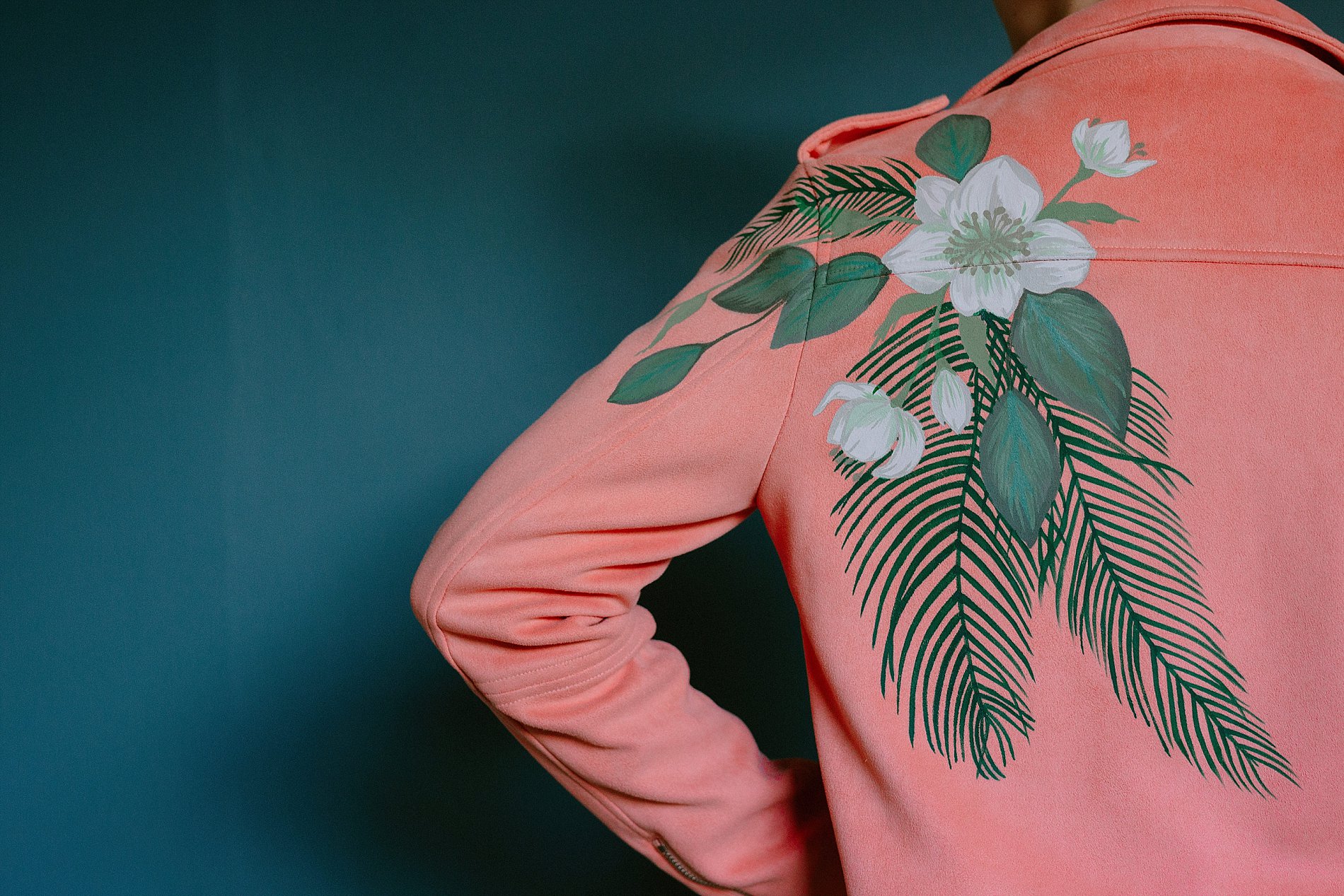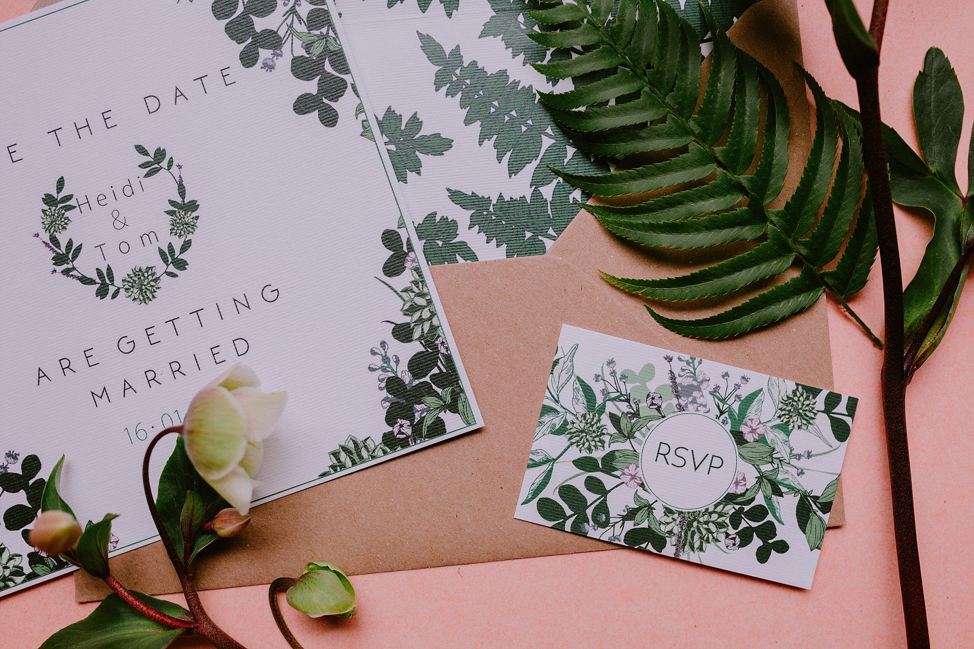 Tracey from Campbell’s Flowers chose ferns and tropical leaves and made an awesome freestanding installation, which was a real focal point for some of our bridal shots. We also had beautiful stationery and a hand-painted leather jacket from Wildwood Paper.