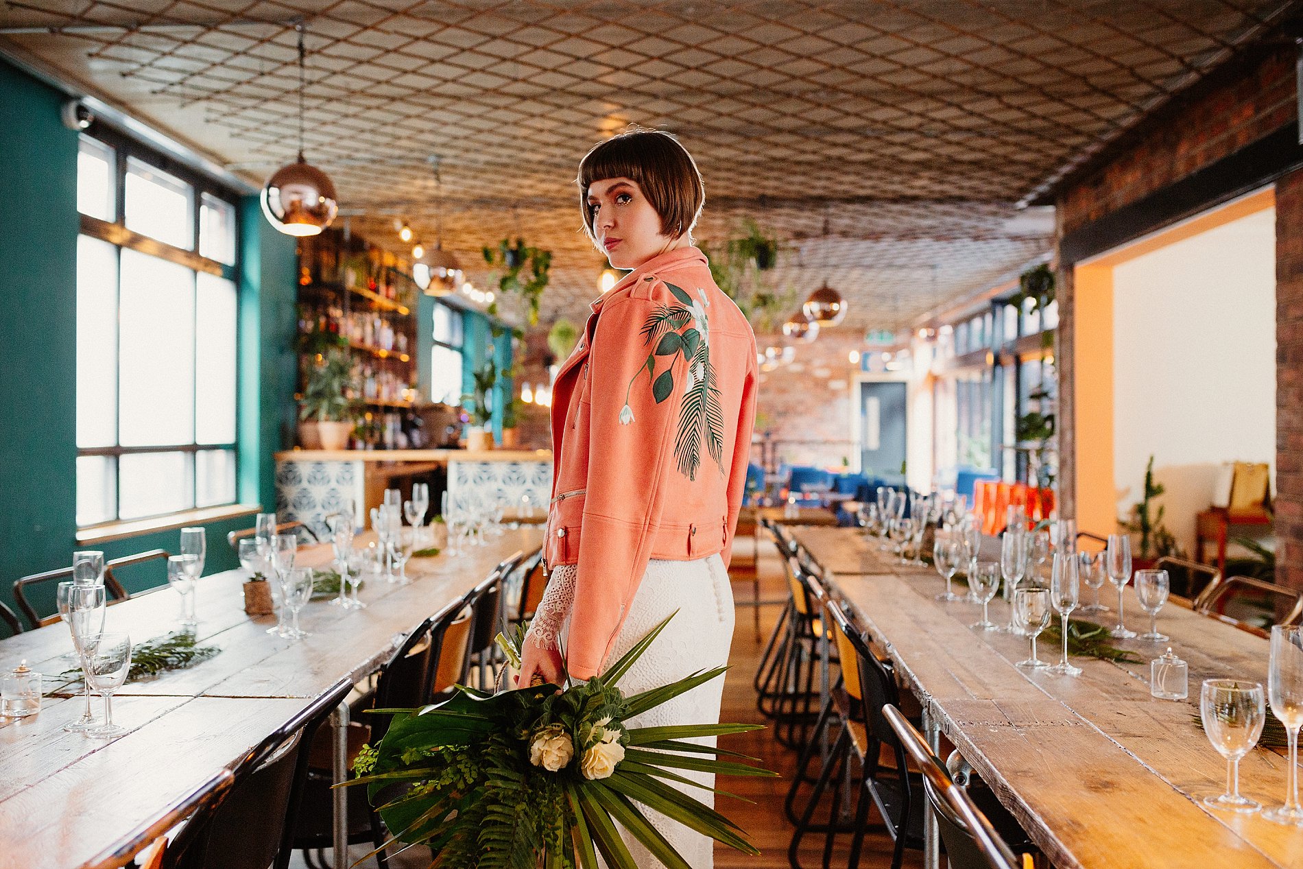 As you may have already guessed, the bride isn’t in your average wedding day attire either – instead the model is rocking fringed detail separates and a coral, botanical illustrated leather jacket to complete the shoot’s edgy boho twist. The result? Scroll down to see for yourself!